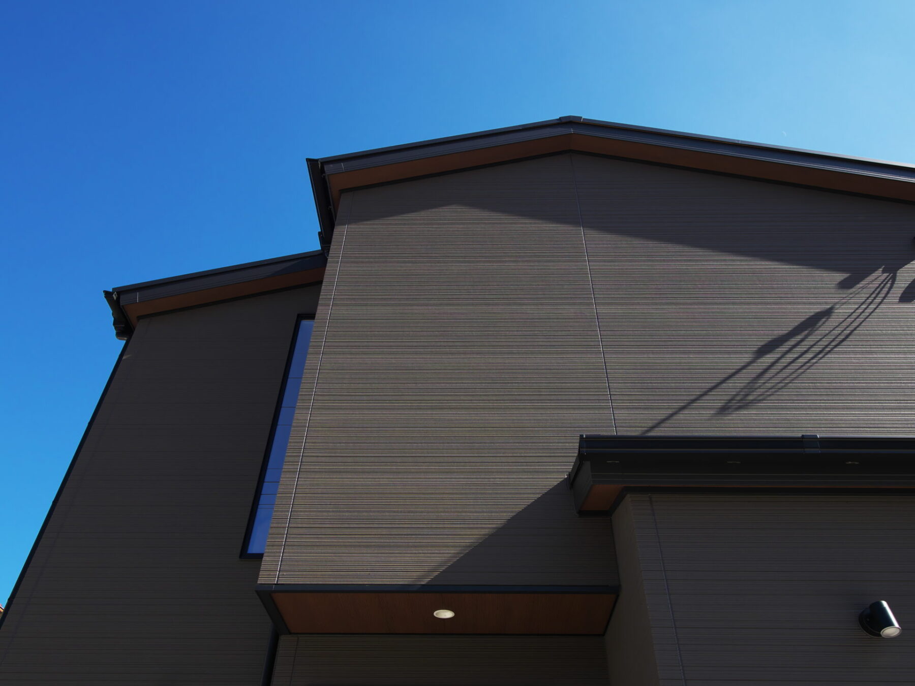 シンプルなブラウン一色の外壁に生える木目の軒天。