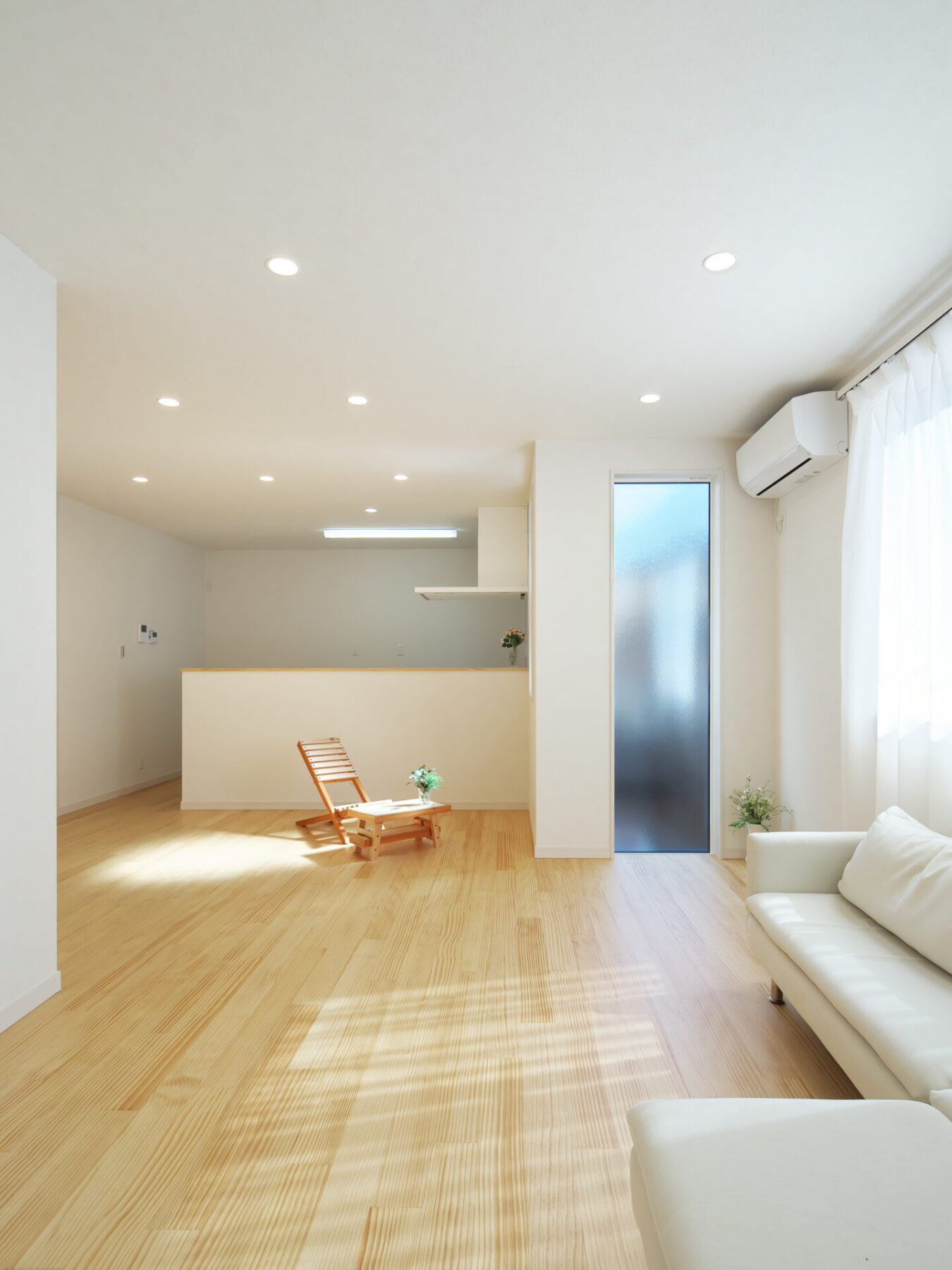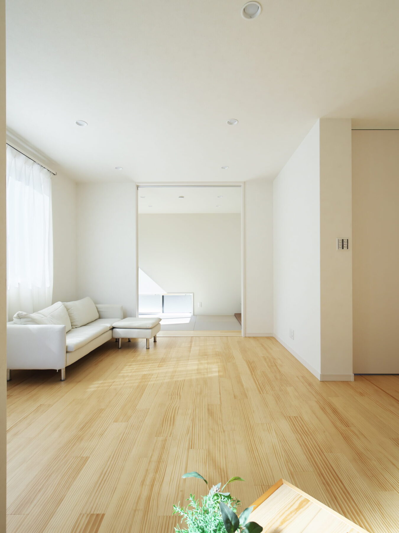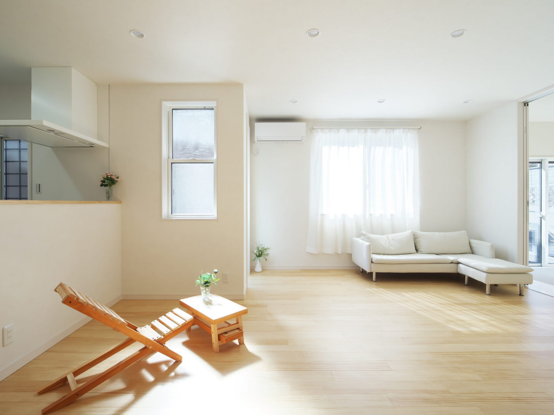 光が燦燦と降り注ぐリビングは17畳。足触りの良い天然無垢のフローリングは、素足で歩くと気持ちいい。