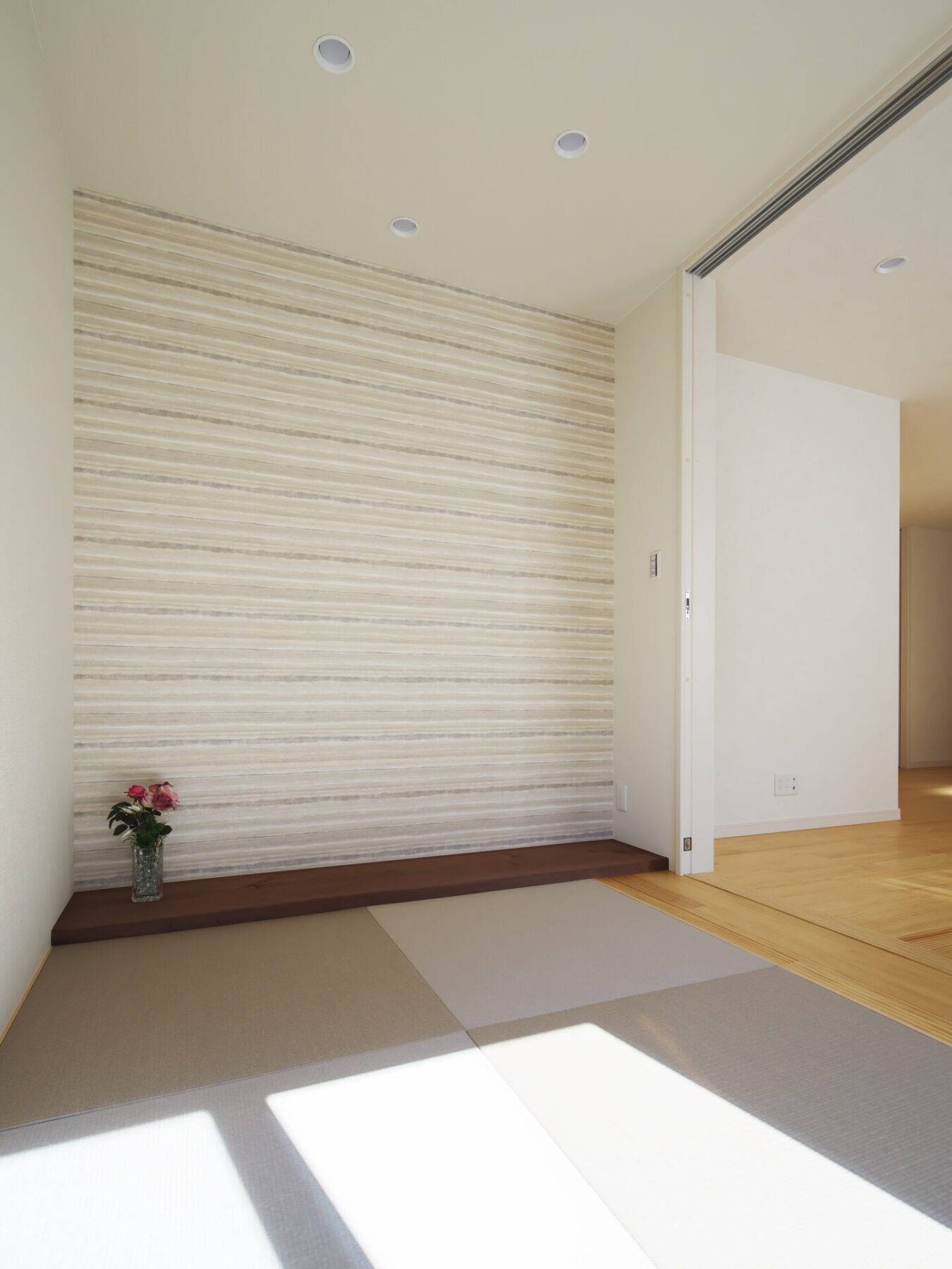 リビングからつながる小上がりの和室は琉球畳を採用。床の間には何を飾っても引き立つ一枚板の天然木。